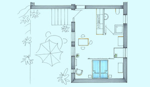 Die “SUITE PAYSANNE” befindet sich im großen Seitenflügel des alten Haupthauses und bietet sowohl einen Blick in den vorderen Garten, wie auch über die eigene Terrasse mit der schönen Aussicht in Richtung der Cevennen.